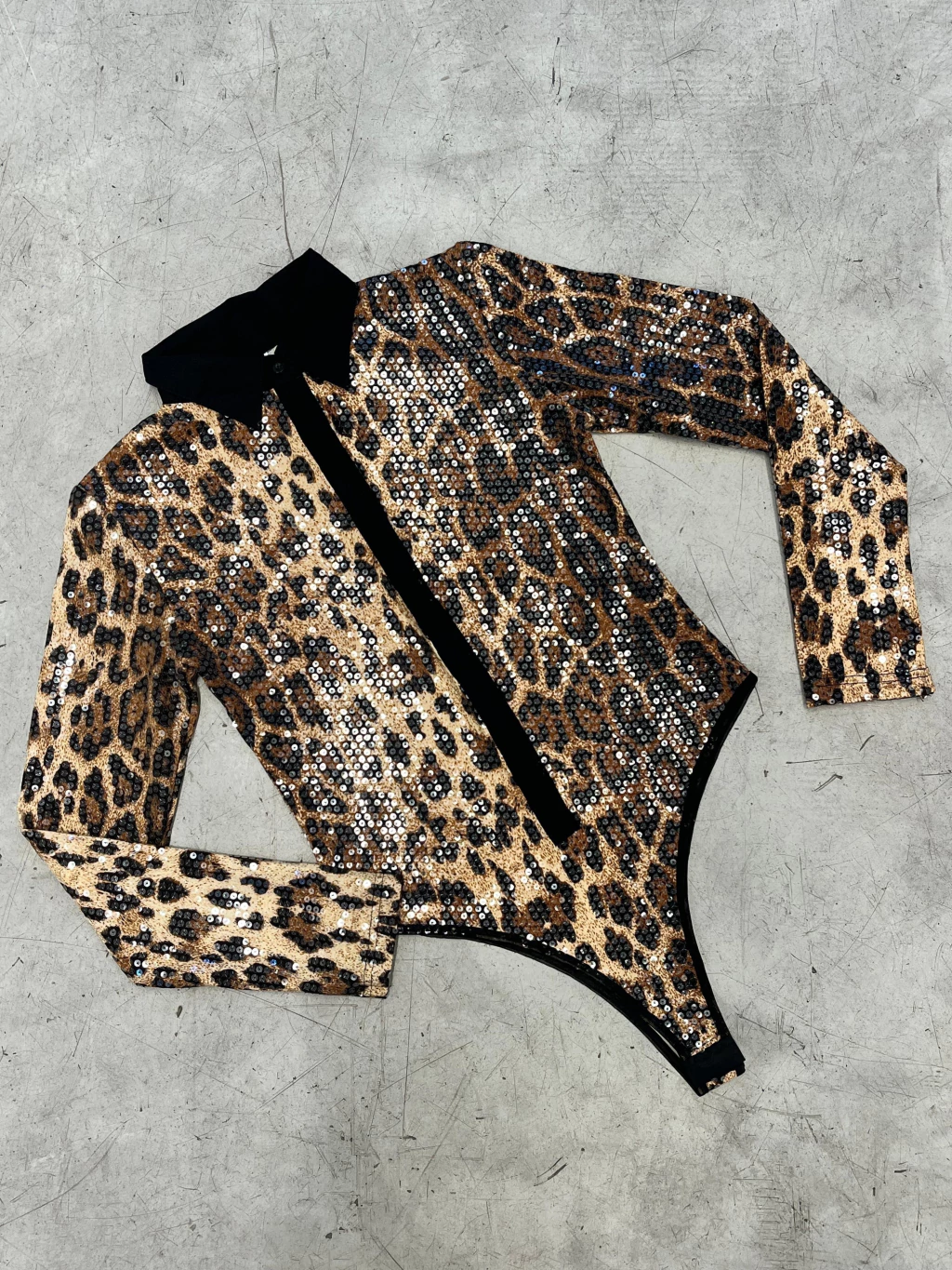 Largo: 72cm Body llamativo en estampa leopardo, íntegramente bordado en lentejuelas, con cuello tipo camisa. Una pieza imponente para looks nocturnos de alto impacto.