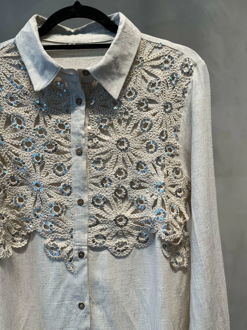 Camisa lentejuelas art 2504 Camisa con detalles en lentejuelas que aportan brillo sutil. Ideal para darle un aire glamoroso a tu look de noche sin perder sobriedad.