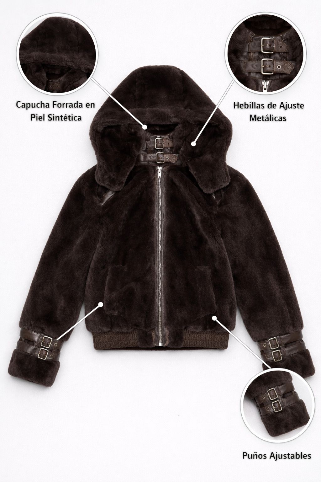 amplia, cierre frontal metálico y terminaciones en puños y cintura que aportan mejor calce. Se destaca por sus detalles de hebillas decorativas en cuello y mangas, que le dan un toque canchero, sofisticado y con mucha presencia. Un modelo abrigado, cómodo y súper protagonista para elevar cualquier look de invierno.