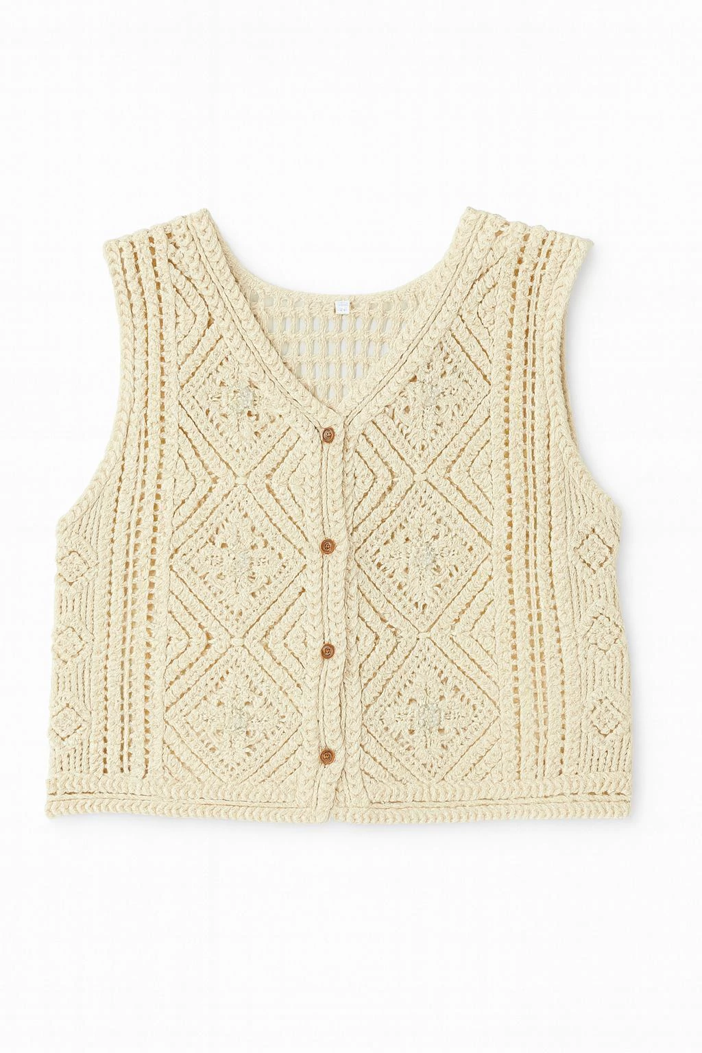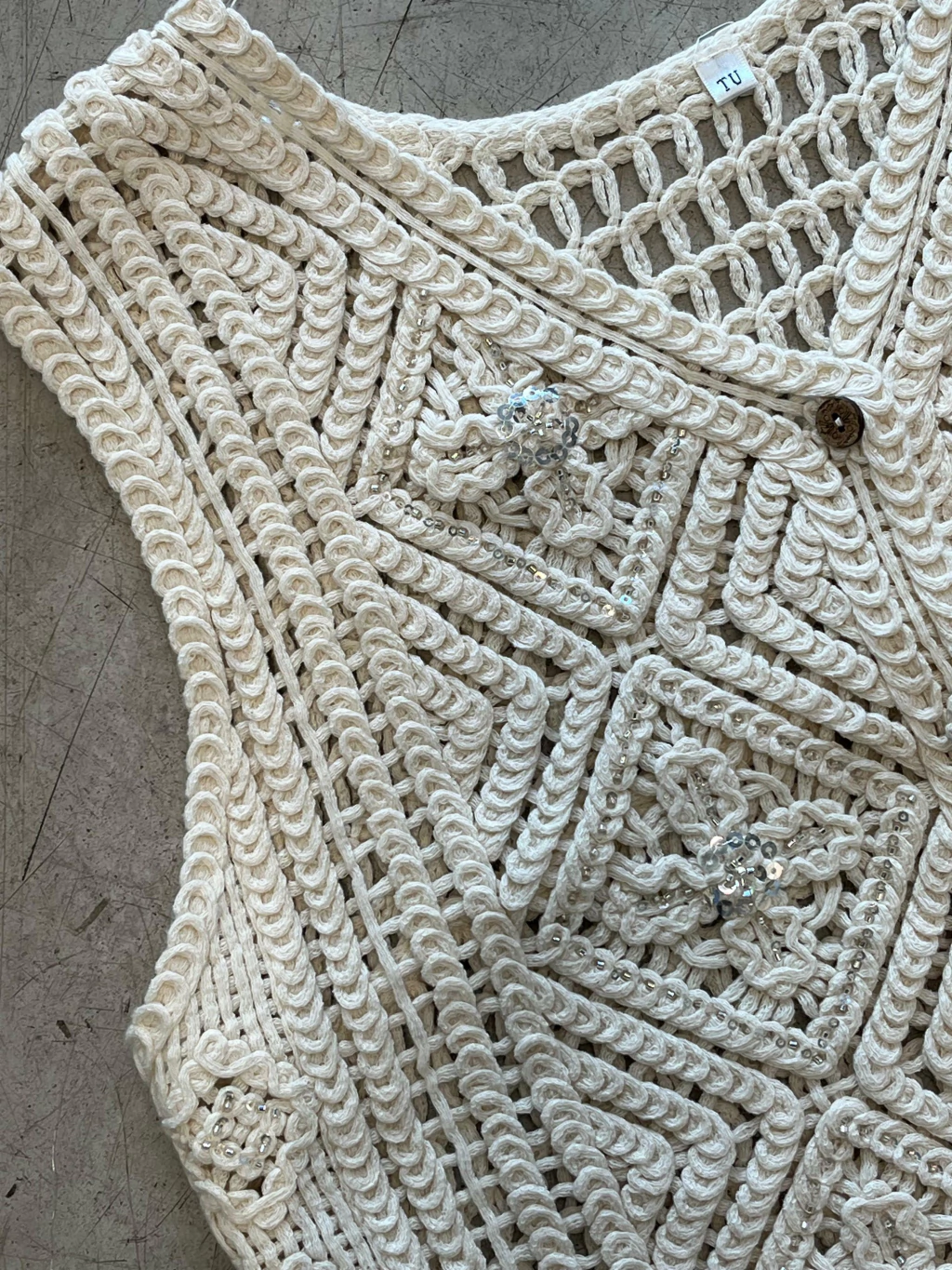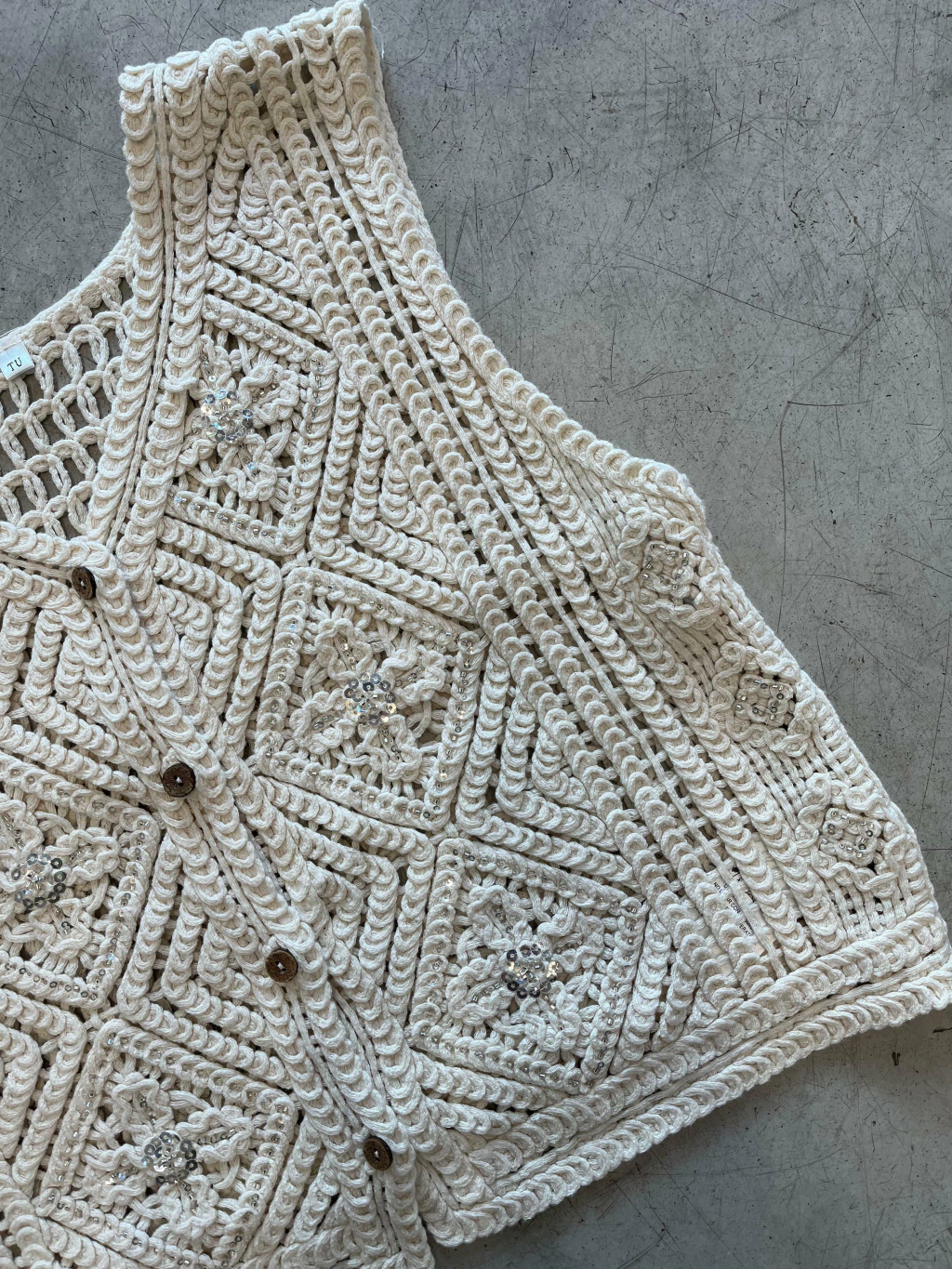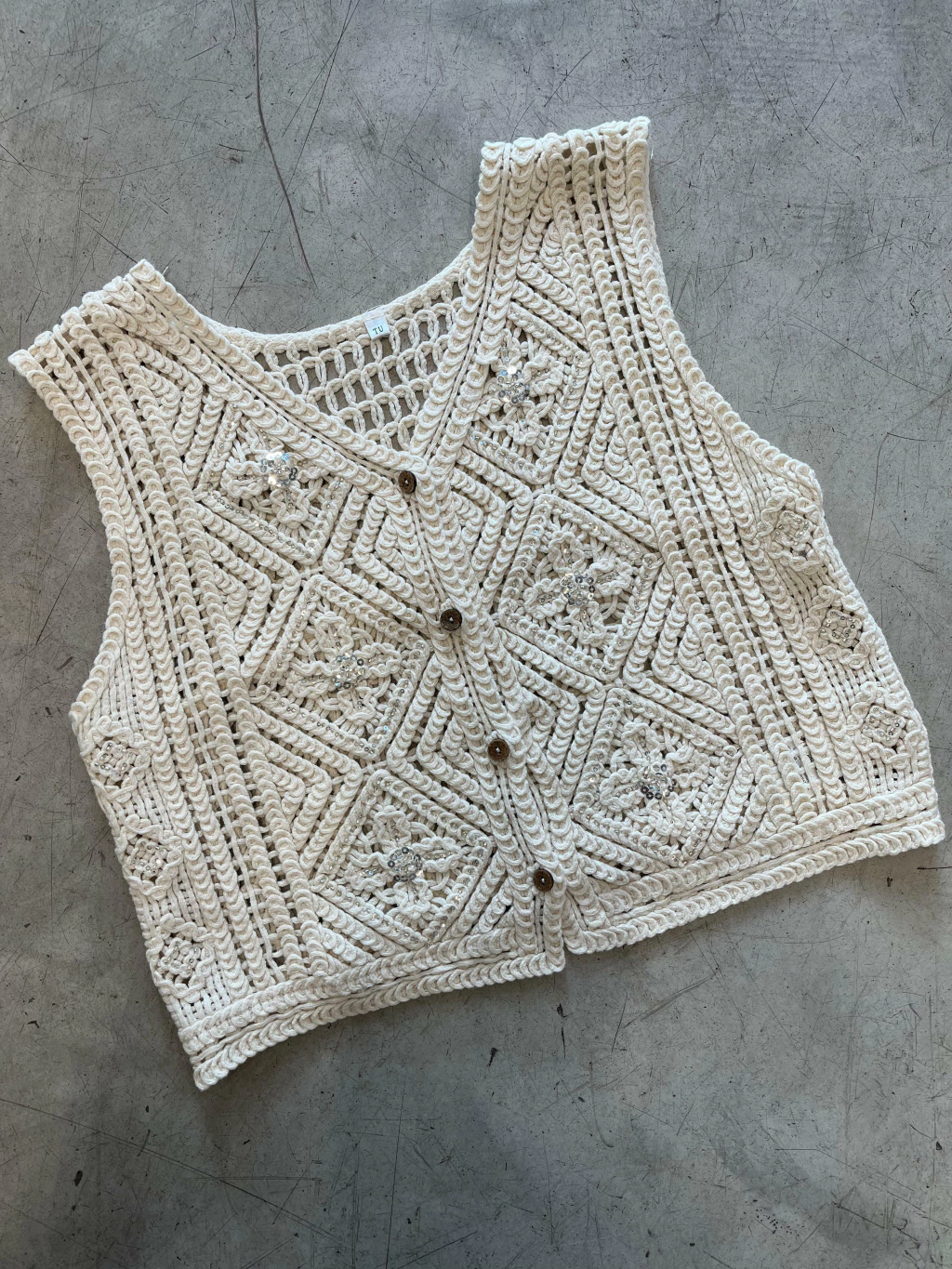 Prenda artesanal en tejido crochet, con calado delicado y cierre de botones al frente. Un chaleco liviano que aporta textura y estilo boho chic a cualquier look.