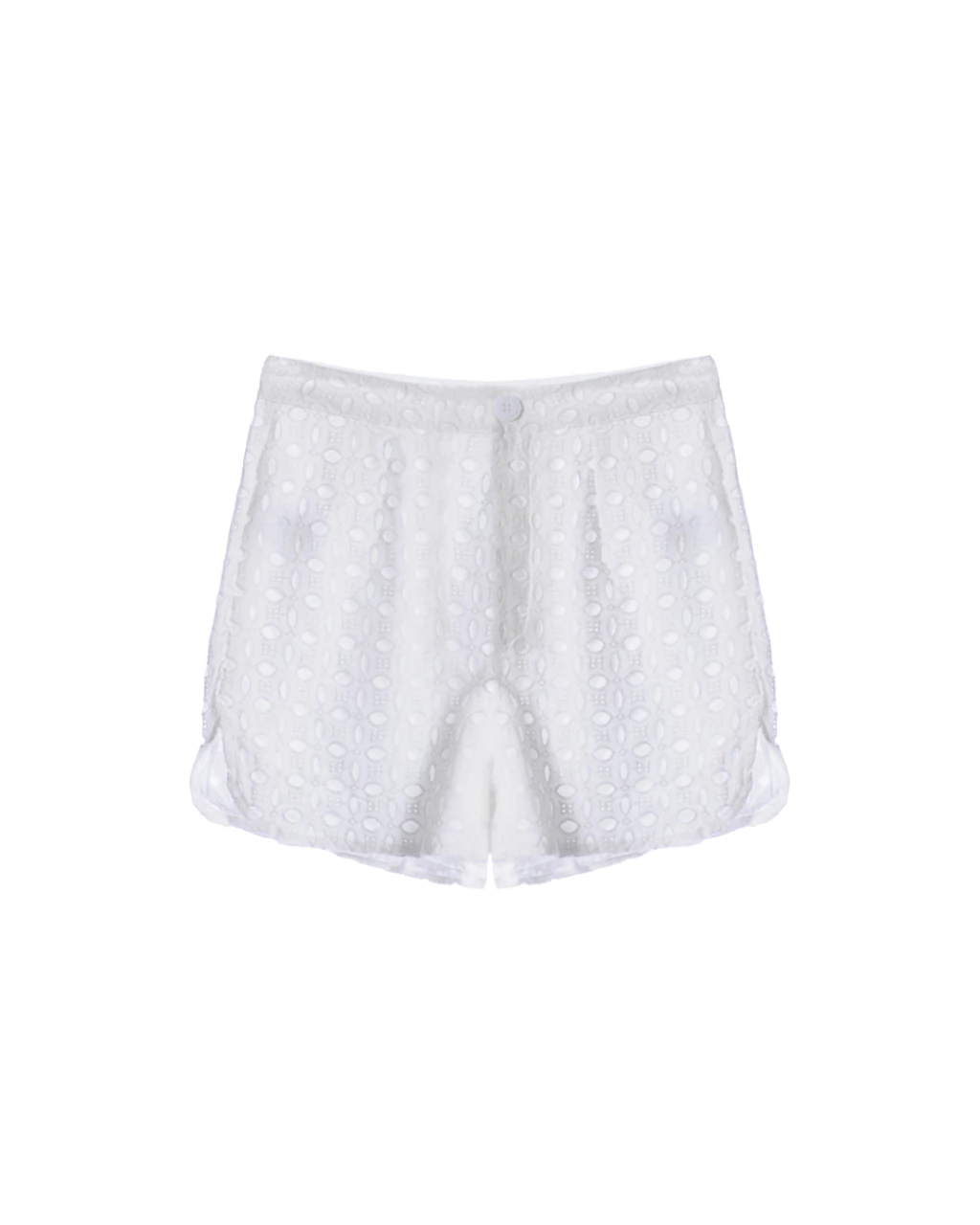 Conjunto delicado en broderie que resalta por su aire artesanal. Una opción fresca y romántica para noches elegantes.
