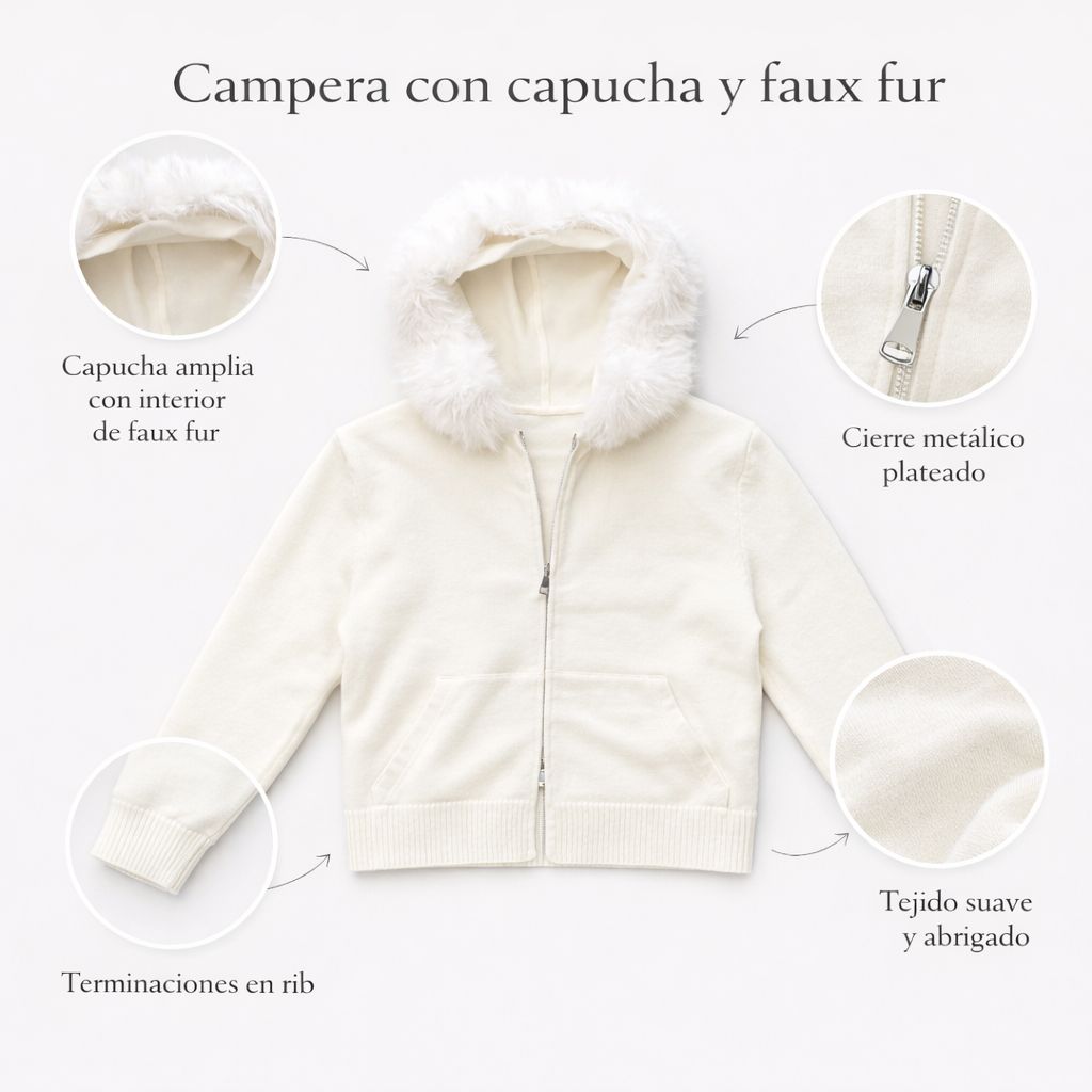 Campera de tejido suave en tono off white, ideal para looks elegantes y delicados de temporada. Presenta capucha amplia con detalle de piel sintética (faux fur) que aporta volumen, textura y un toque sofisticado.