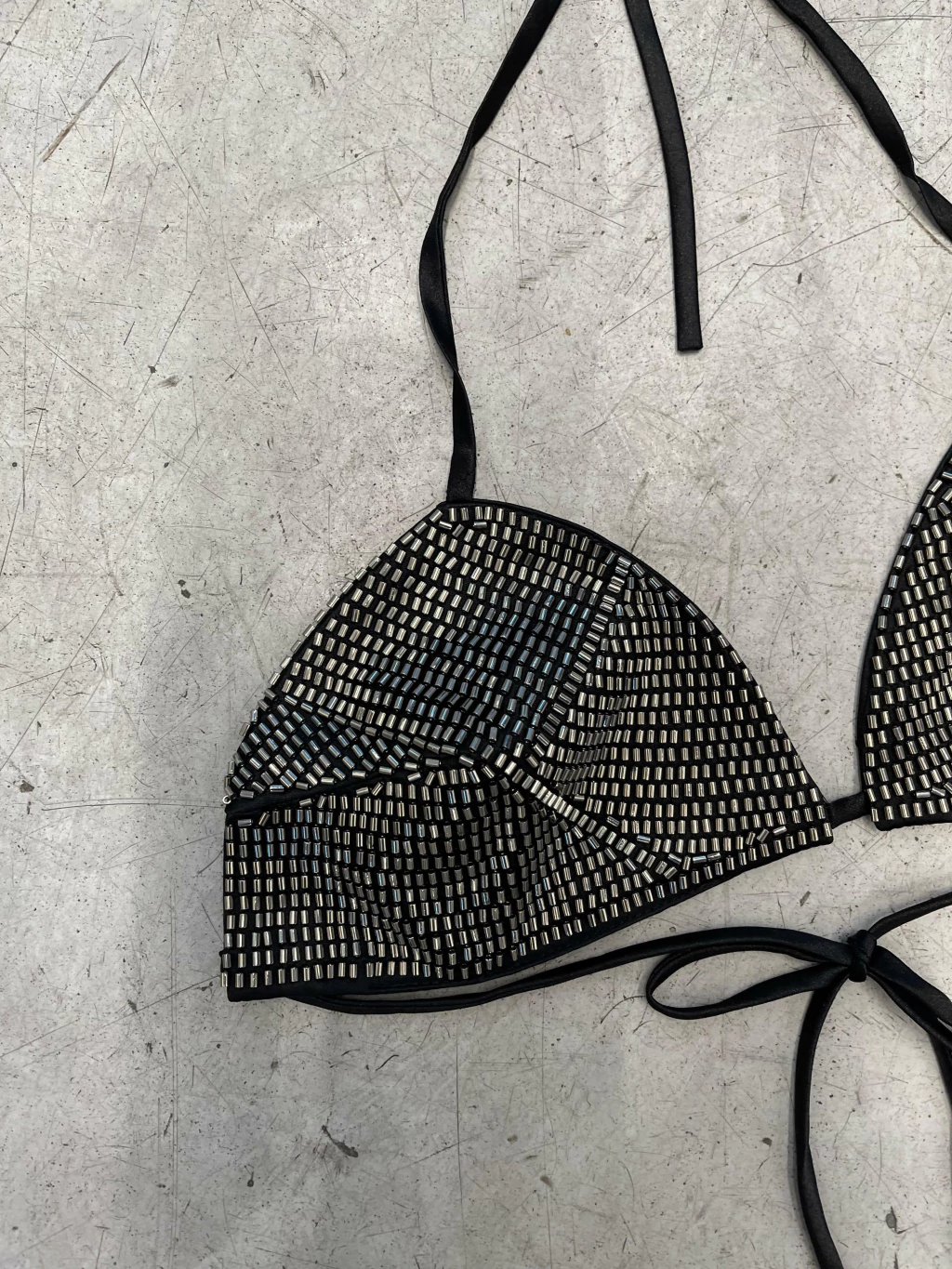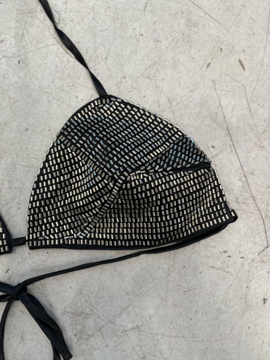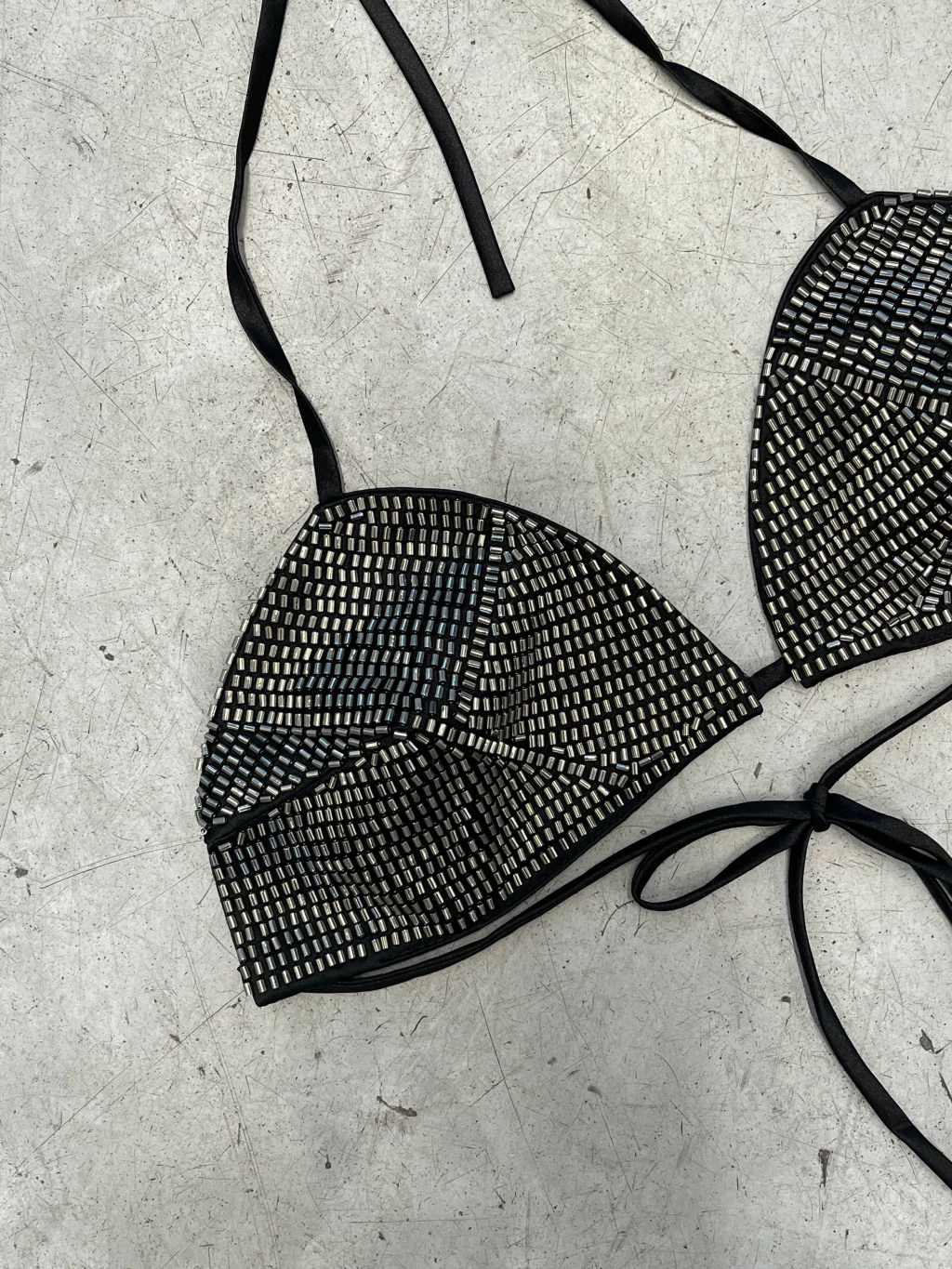 Un corpiño trabajado artesanalmente con mostacillas que aportan textura y brillo. Ideal para acompañar looks audaces con un toque sofisticado.