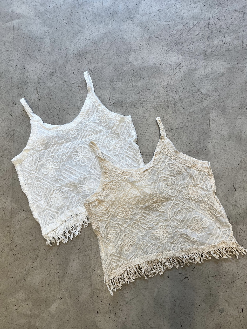 Top liviano con textura bordada y terminación con flecos. Estilo bohemio ideal para el verano.