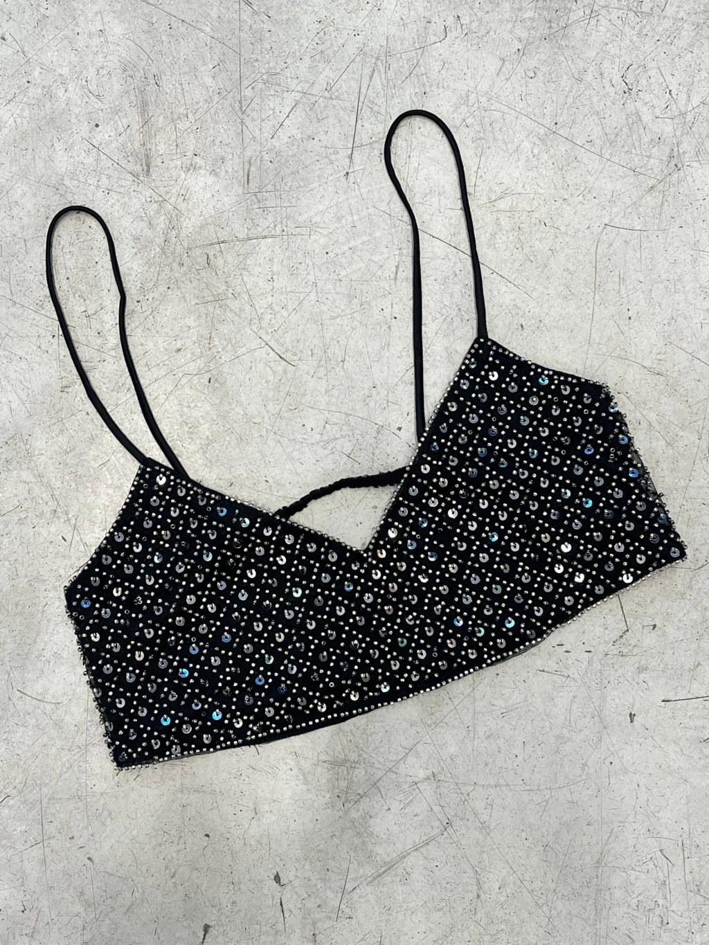 Top negro decorado con mostacillas brillantes que realzan su diseño. Una prenda con personalidad, perfecta para elevar tu outfit nocturno.