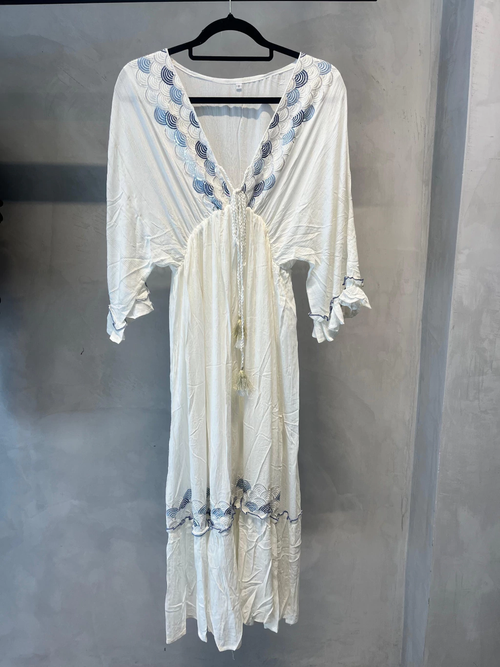 Vestido largo estilo boho confeccionado en gasa ligera, con detalles bordados en celeste pastel. Sus mangas a media altura lo convierten en una prenda romántica y etérea.