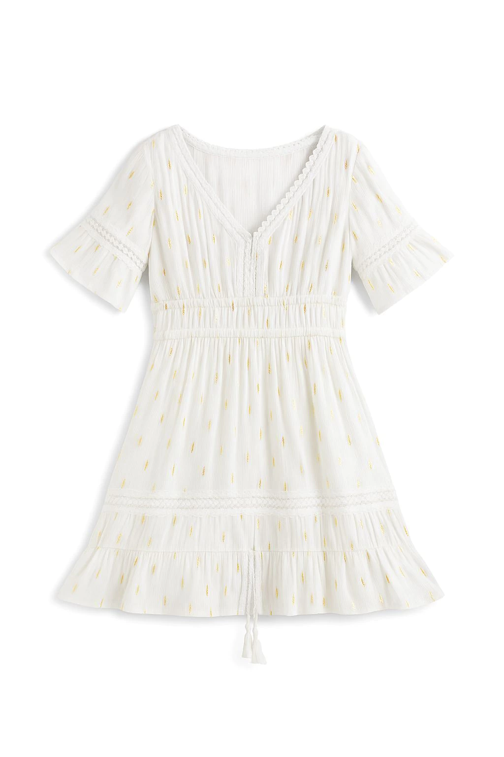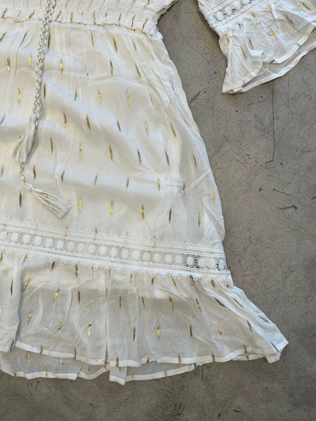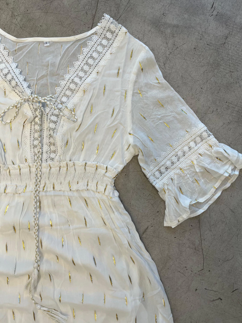 Un diseño boho chic en color crema con mangas acampanadas y delicados detalles dorados. Perfecto para un look fresco y sofisticado en eventos.